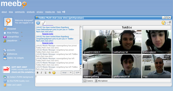 For now TokBox is only launching this feature via their Meebo integration – this also means all participants can simultaneously text chat during the session as well. SnapYap, a sponsor of our recent Boston meetup, is a competitor to Tokbox (and by the way, see some video footage of the event here).