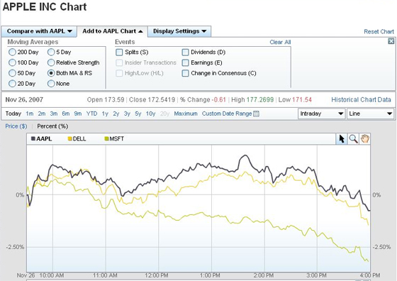 The chart below shows Apple’s stock price compared to Microsoft and Dell over the same period.