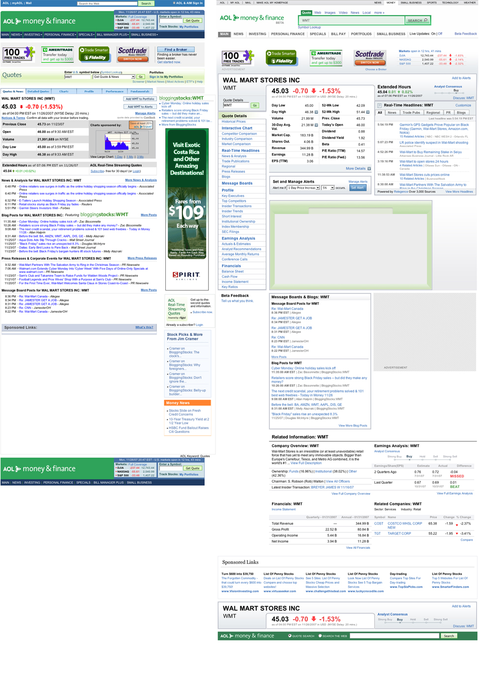 Third place doesn’t suit AOL’s SVP Money and Finance Martin Moe very well, and his team is making a run for more users. This morning at 6 am EST they are launching an entirely redone AOL Finance – complete redesign and a lot of new features. Moe gave me a demo of the new site and explained some of the key features. I’ve put the old site next to the new site for an example company (Walmart) – see the image here.