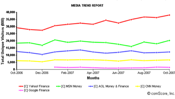 Even though AOL has not kept its service as cutting edge as the competition, they still move a lot of traffic. Recent worldwide comscore stats put them third behind Yahoo Finance and MSN Money with 12.2 million unique monthly visits. That’s well ahead of CNN Money (6.7 m) and, surprisingly, Google Finance, which is dead last among the large finance sites (1.5 m).