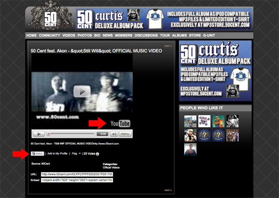 Flux relies exclusively on external video services like YouTube or Brightcove for videos. Here’s an example of a video on Interscope’s 50 Cent website: