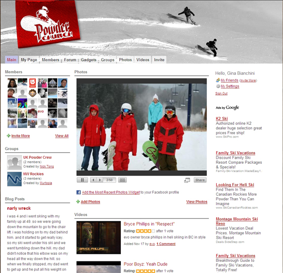 Here’s an example of Powder Church, a social network on Ning for skiers: