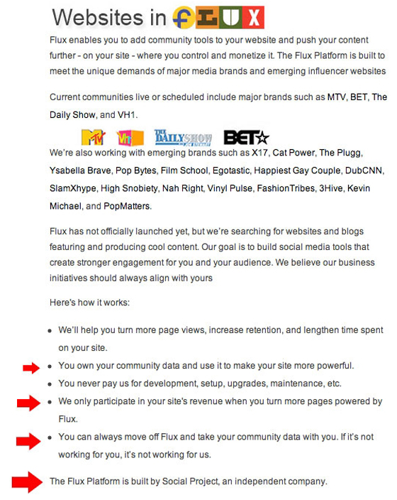 Flux, which launched in September, is a joint venture between Viacom and Social Project (formerly Tagworld). They are pre-launch, but power a number of social networks around Viacom properties (including MTV) and third party sites.