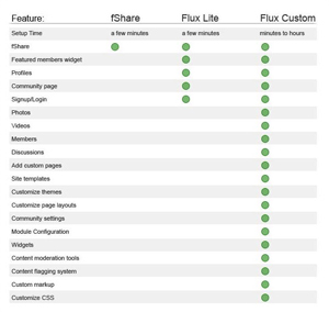 Partners have three integration choices. fShare, the basic integration, allows users to take content from the site and easily embed it into other social networks. Flux Lite allows partners to create a basic social network. Flux custom gives nearly full control over the look and feel and has additional features. Partners can choose any integration, it just takes a little more work to use the custom features. Flux will add new developer features over time as well. The chart to the right (click for larger view) shows the various options.