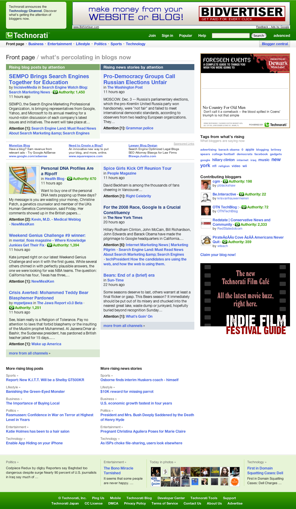 The topics feature that Technorati launched in September (front page, business, entertainment, lifestyle, politics, sports, technology) is now highlighted directly via navigation tabs on the home page.