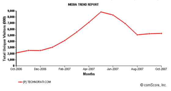 Comscore and Compete show slow and erratic growth over the last year. Comscore says they have 5.3 million unique visitors and 20 million page views per month, up from 2.1 million and 9 million, respectively, a year ago. Technorati says those numbers are about half of what their internal stats show.