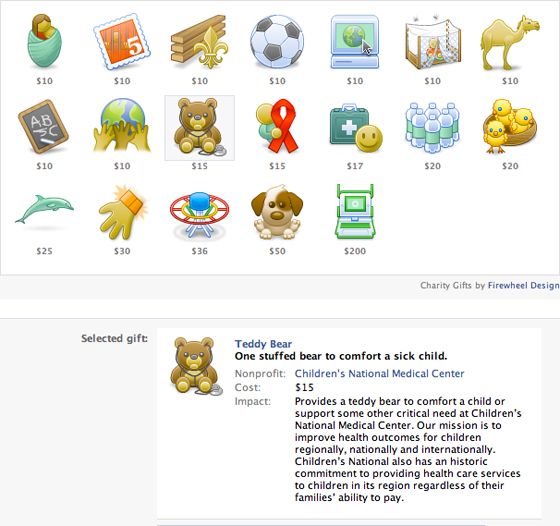 But now you can give a gift that says a little more than “I spent a dollar on you.” With Gifts from Causes, you can give a $10 – $200 gift to a friend. Each virtual gift (see image below) benefits a different charity. 100% of the proceeds (minus only credit card fees) go directly to the charity.