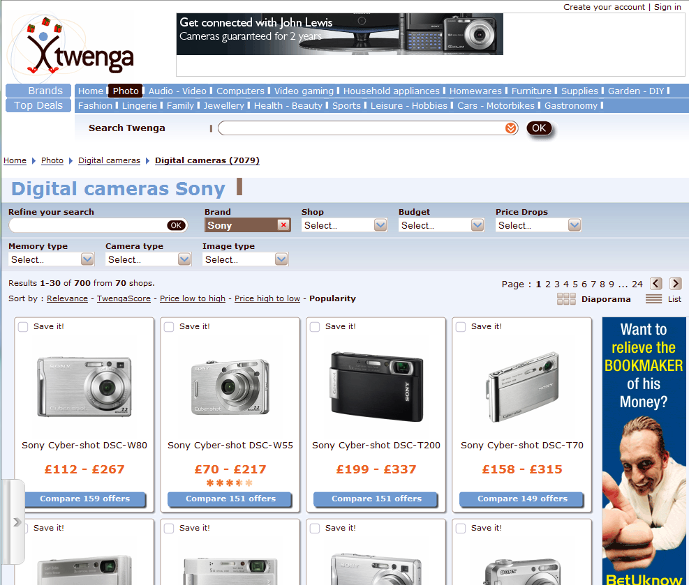 Of the engines, Twenga is most like “The Find”. Search results are returned as a wall of product images and can be refined by price and features. It also has several advanced features include price tracking and user reviews. This allows the engine to run more complex searches properties such as a 10% price drop. It also focuses on Europe and comes translated in an impressive six different languages (French, German, Italian, Polish, Spanish, and English). The network reached 7 million visitors in November 2007 and indexed over 40 million offers from 25,000 merchants