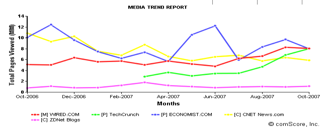 And just for fun, here is a chart showing pageviews over the past year for Wired.com, News.com, Economist.com, TechCrunch (with CrunchGear), and ZDNet Blogs. TechCrunch is the green line.