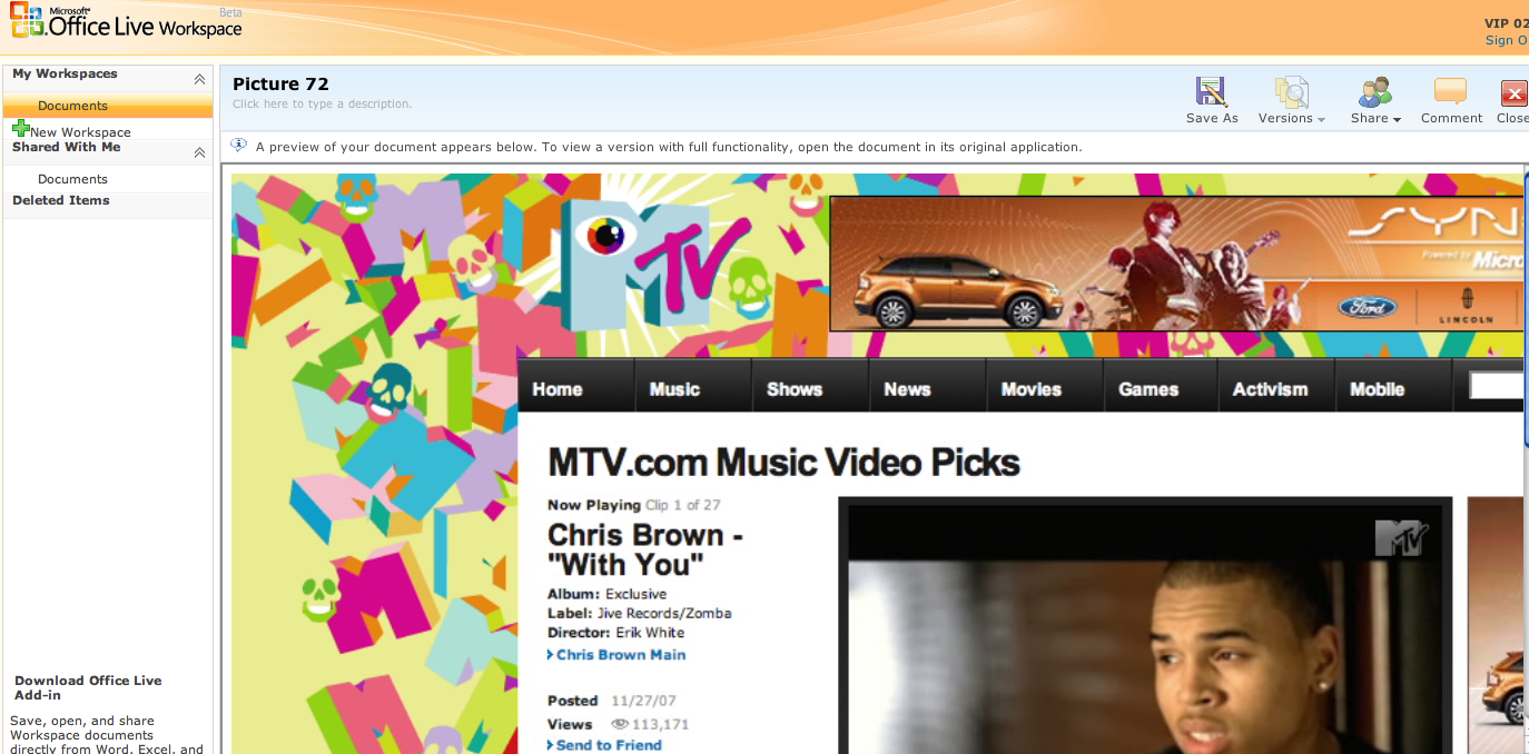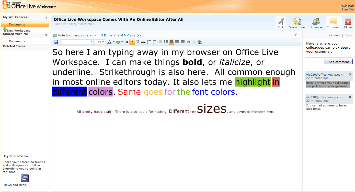Assuming you do have a PC running a recent version of Office (a safe assumption for most people), the integration and syncing works pretty seamlessly. With one click you can save a document to your desktop and it opens up in Word, where you can work on it. Then when you close it, the new version is saved to Office Live automatically. On Office Live, you can share the document with others, who can make comments inside Office Live, or edit it themselves by going through the same process of downloading it into Word. Office Live keeps track of all the different versions.