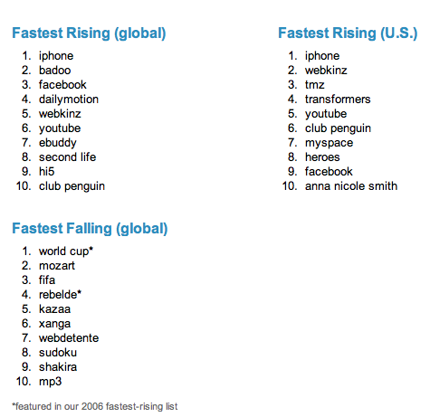 In our ongoing series of top search terms for 2007 (check out Yahoo’s list here), Google released its <a href="Zeitgeist list for 2007 of fastest rising and fastest falling search terms (see below). And guess what? The Google Zeitgiest list for fastest growing U.S. terms is the same as what we reported ten days ago. But Google did release terms for global searches as well. The No. 1 fastest growing search term in both the U.S. and globally this year was ‘iphone.” But No.2 globally was London-based social networking site “badoo,” instead of “webkinz” in the U.S. “Badoo” didn’t even make it onto the U.S. list. Other terms that made the top-ten globally but not domestically: “dailymotion,” ebuddy,” “second life,” and “hi5.”