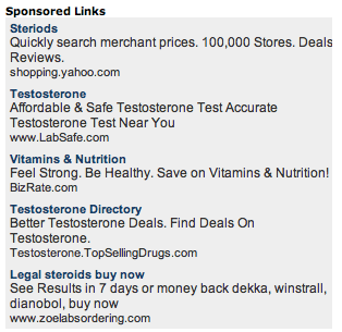 I don’t see the steroid ads popping up anymore on that CNN page, so maybe someone at CNN (or Google) got wise to the inappropriate mismatch. (Although, if you were in the market for steroids, you would probably be reading such stories). But the same types of ads come up when you do a search for “steroids” on CNN.com:
