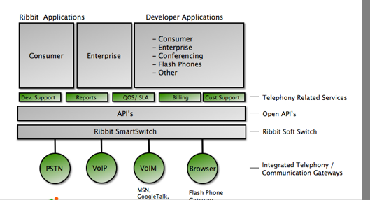 For the most part, Ribbit plans on charging for its calls. “There is a company a week that tries to avoid paying for the call. We are not doing that,” says Crick Waters, senior vice president of strategy. It is free to play with the API’s and develop a Ribbit phone application, but once it goes into production and actual calls begin, Ribbit will start charging. Pricing will start at $30 a month for 20 simultaneous sessions, or seats (for, say, call center reps logged into the application making and receiving calls), plus per-minute fees to the regular phone network. (Internet calls are free). The developer can then choose to charge its customers or provide it for free, and make up the cost in other ways. There probably will be free consumer apps from both Ribbit and its developers, but the business opportunity here is for enterprise voice applications that can be charged for. Instead of developing a custom call-center application for $250,000, for instance, an entrepreneur could build the same thing for much less on Ribbit and charge, say, $5 a month per customer service rep (with Ribbit taking $1.50).