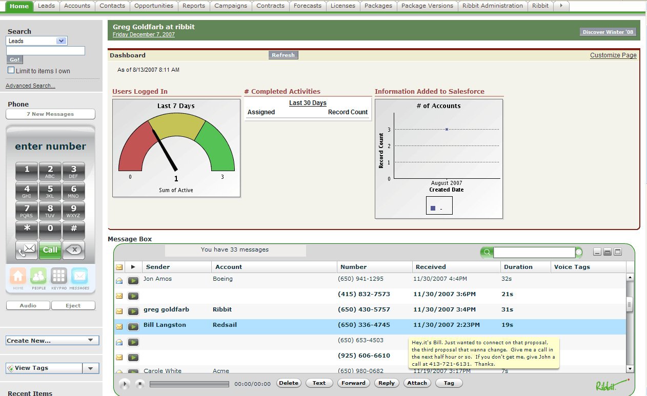 Today’s launch is a developer launch, not a consumer launch (that will come later in the first quarter of 2008). It is releasing a more robust version of its APIs for its private developer beta, which is open to any programmer. Already, about 600 developers have built Ribbit apps under certain restrictions (they are not allowed to go live on the Web until early next year). These apps range from an Adobe AIR iPhone that can make calls from your computer to a Flash phone with a chalkboard interface to a browser-based phone that works inside Salesforce.com (see screen shot below).