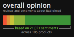 Summize harvests all of this opinion and boils it down to a single heat map that it calls a “snip.” This is a horizontal bar with colors ranging from red (wretched) to yellow (so-so) to green (great). It attempts to capture the collective sentiment about any given product at a glance. For instance, out of 21,021 opinions about the band Radiohead, 67 percent are “great,”, and only 10 percent are “bad” or “wretched.” The band’s most reviewed album is Kid A, the most liked is OK Computer, and the most buzzed about is their recent online pay-what-you-want freebie In Rainbows. There are links and excerpts from recent blog posts about Radiohead. And, in a nice twist on Amazon-like collaborative filtering, every product has a list of related products. In this case, “bloggers who discuss Radiohead also discuss” Band of Horse, The Pixies, and Idelwild.