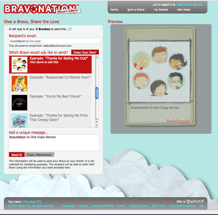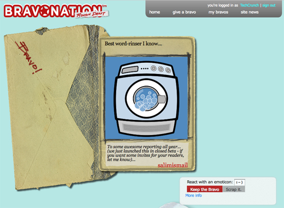 I suspect FireEagle will be a hit over time. BravoNation, not so much. Right now it’s basically a greeting card site with a currency attached to limit the number of awards that can be sent (and thereby, presumably, to attach artificial value to the awards). Users choose from a variety of pre-selected images and then write their own message. There are a number of examples, such as “You’re My Best Friend!” and “Thanks for Saving Me From That Creepy Date!” You can also use a basic Flash tool to draw your own image. The FAQs say that soon users will be able to upload images, too.