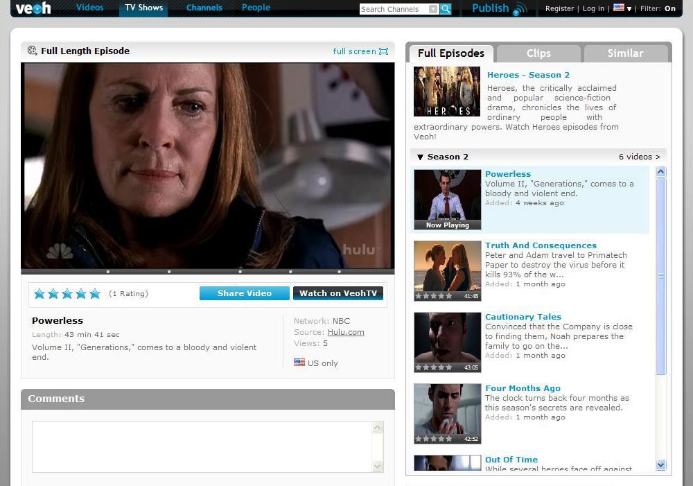 Today, video Website Veoh.com is adding more videos from traditional TV networks, including NBC (The A-Team, The Office, Heroes), Fox (The Simpsons, Family Guy, 24), the Sci-Fi Channel (Battlestar Galactica), the USA Network (Monk), and FX (Damages). All of this new content comes from Hulu, the NBC-Fox joint venture. CBS content was already on the site through a previous deal, but now all videos from traditional TV networks can be found under a new “TV Shows” tab on its main page today, which replaces the “Series” tab. (Video series can now be found in the “Channels” tab).