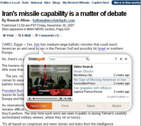 Now ClipSyndicate is spreading its API to video search sites like AOL’s Truveo and other services like Magnify (which we reported earlier) and Lingospot. For instance, ClipSyndicate videos come up in regular video searches in Truveo and play in an embedded ClipSyndicate player. On this Magnify page for Barack Obama, the “Obama News” videos come from ClipSyndicate. And Lingospot, which creates an in-text search bubble when you mouse over a linked term (see left), can show ClipSyndicate videos in its bubbles. You can even find ClipSyndicate videos on Bebo, although you have to look hard and there is no official deal yet with the social networking site.