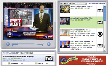 ClipSyndicate serves ads with the videos and splits the proceeds as follows: 30 percent to the content producer (i.e., the local TV station), 20 percent to the API partner or Website where the video is seen, and 50 percent for itself. (Although the beta and APIs are available by invite only, the company plans to open up participation to all comers by the end of the first quarter). Critical Media CEO Sean Morgan tells me that he is getting $50 CPMs on the video ads sold through his salesforce compared to $8 to $12 CPMs from backfill video ad networks because the videos tend to appear on extremely targeted sites. Think Yummy Chummy ads on PetsHealthFocus. His sweet spots are mortgage, pets and animals, and health sites. He also claims that he is seeing close to three percent click-throughs on his graphical banner ads compared to quarter-point click-throughs on run-of-network ads.