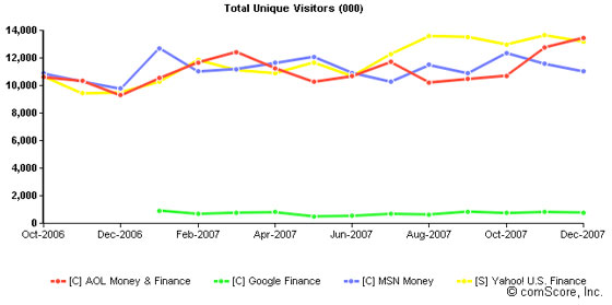 December Comscore data is now available, and it shows a steep rise in traffic for AOL Finance. They’ve passed both Yahoo and Microsoft to take the top spot in terms of unique visitors. AOL rose from 12.2 million unique visitors in November to 13.5 million in December, a 10% increase. Meanwhile Yahoo dipped from 13.7 to 13.2 million unique visitors, and MSN Money dipped from 11.6 to 11 million visitors. The combined decrease in Yahoo’s and MSN’s audiences is almost equal to the gains by made by AOL.