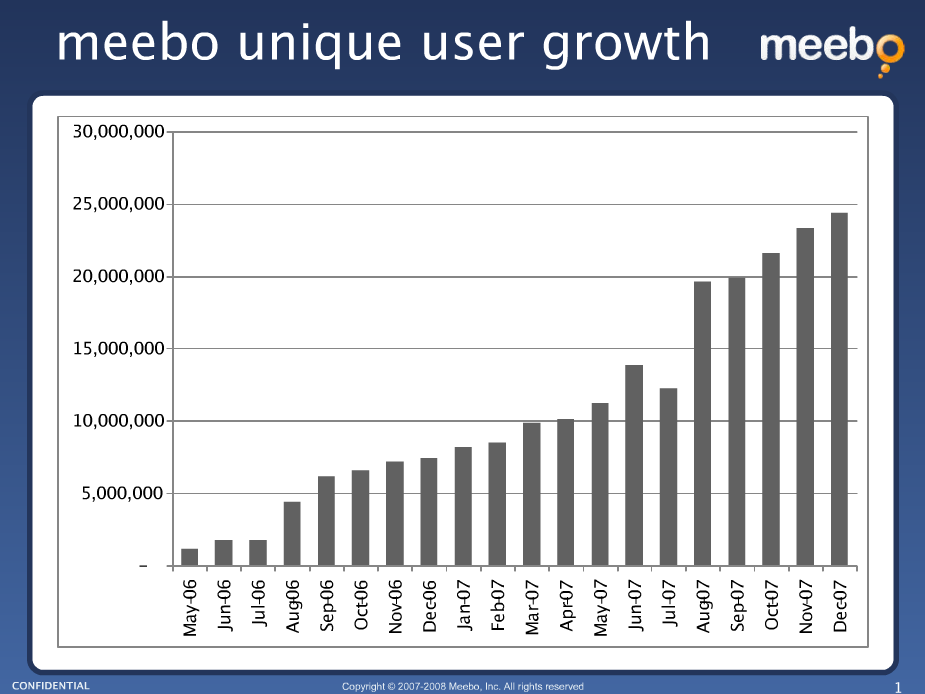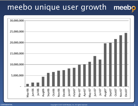 In October 2007, the most recent period available, comScore measured 6.3 million people in the U.S. who actively engaged with a Meebo widget, compared to 1.2 million who visited Meebo.com. Worldwide, Meebo widgets engaged 19.8 million people, compared to 4.3 million for the site. So in the U.S., Meebo is getting 84 percent of its traffic through its widgets, and 82 percent worldwide. Yet the site still gets higher levels of active engagement than the widgets. All told, Meebo transfers 150 million IMs a day, and only about 20 million of those are generated in Meebo Rooms.