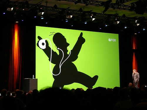 10:05am: Gianopulos explaining the Apple/Fox deal with a Homer Simpson iPod graphic.
