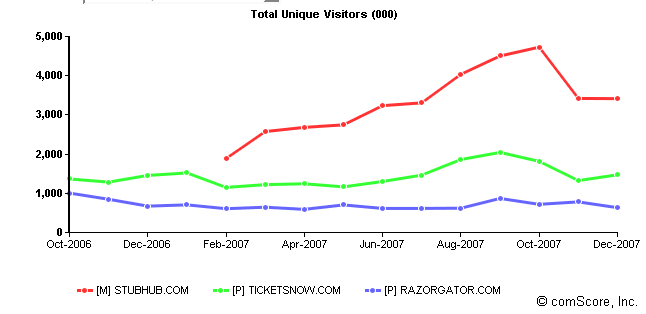 According to comScore, TicketsNow had 1.5 million unique visitors in December, about the same it did a year ago, while StubHub attracted 3.4 million and has been growing nicely under eBay’s wing (although it took a major hit in November).