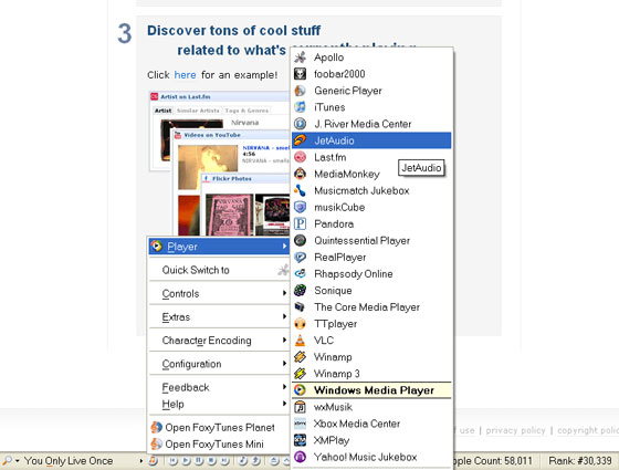 The Foxytunes core service is a Firefox plugin that allows users to control their favorite media players from the browser. It has a small but loyal following, who also use their tangential services (an email/blog signature tool and FoxyTunes Planet, a site that aggregates music information).