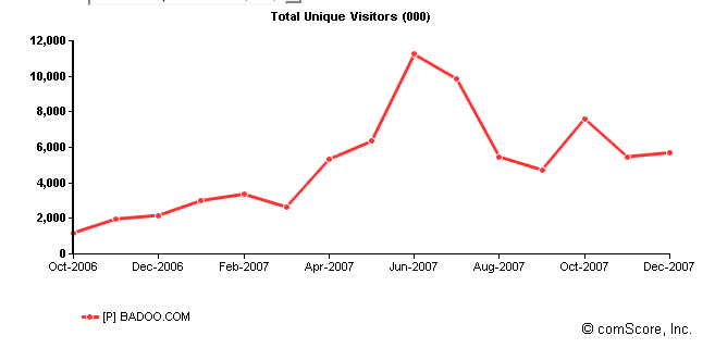 comScore shows erratic swings in worldwide traffic, peaking last June at 11.2 million unique visitors, and now at 5.7 million as of December: