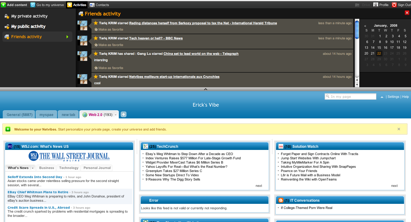 Netvibes is a customizable start page that lets you add any RSS feed, as well as other apps in the form of widgets that you can drag around the page and place anywhere you want. With Ginger, Netvibes has a new Ajax user-interface that pops down a pane from the top whenever you want to add new widgets to your personlaized start page. It also now lets anyone create their own public “Netvibes Universe” page (before, these were just pages for brands). You can star items in any feed as a bookmarking feature, and there is now an activity stream so you can see what your friends are publicly starring and sharing as well. There is still no internal messaging system, however.