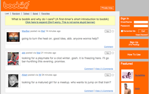 The tenets of Web 2.0 are not without their pornographic, or otherwise erotic, applications. We’ve covered PornoTube and EroShare, both of which are sites for user-generated porn. Now we’ve come across a site called Boobik? (yes, with a question mark in its name, and no, NSFW). If PornoTube is a YouTube of porn and EroShare is a Flickr of porn, then perhaps it’s best to describe Boobik? as a Twitter of porn.