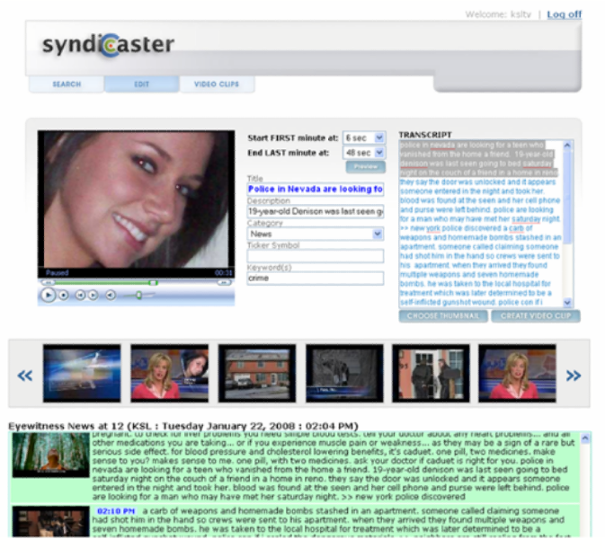 They simply select the portion of the video they want by highlighting the desired section of an accompanying speech-to-text transcript. Then they can download the clip as a WMV or Flash file for republishing to their Websites, automatically distribute them across the Web through ClipSyndicate (Critical Media’s TV-to Web syndication platform), or transcode the video clips and send them to iTunes.