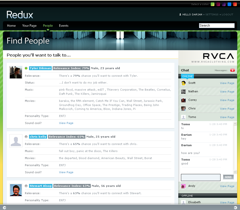 Finally, Redux closes the loop by encouraging compatible people to hang out at any of the thousands of public events they’ve pulled from sites like Upcoming.
