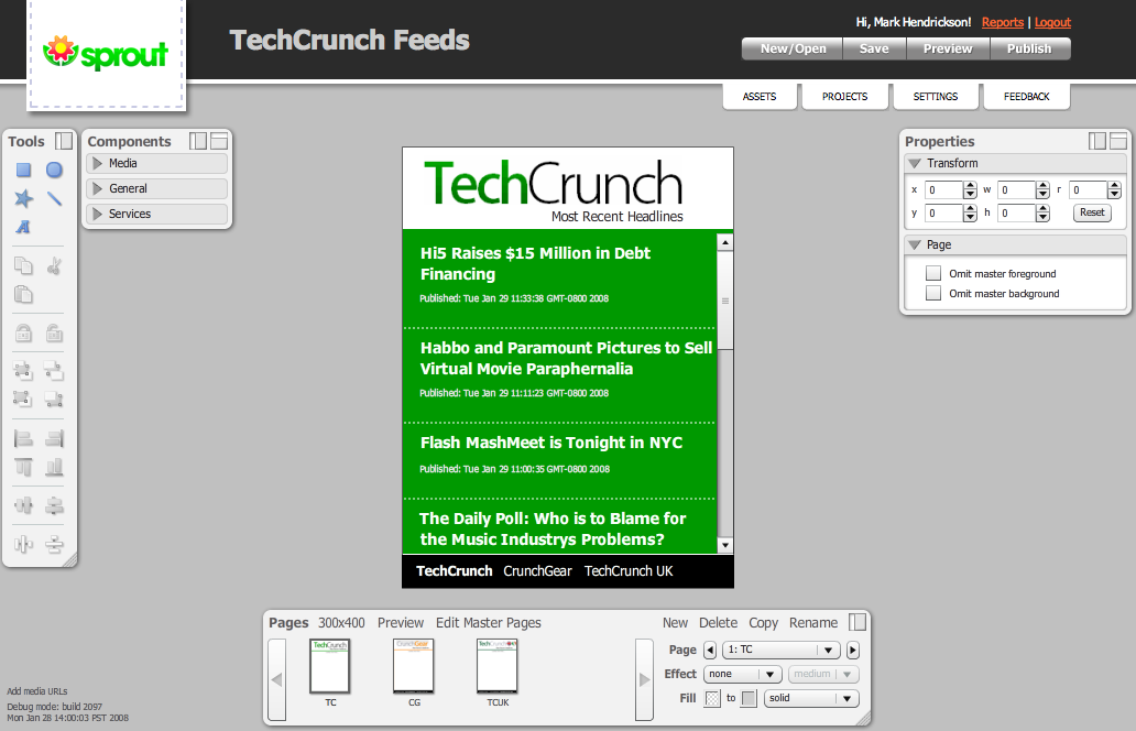 The application itself is entirely Flash/Flex-based and won’t require account registration for first-time users (that is, once the private beta period is over). As can be seen in the screenshot to the left, the interface consists of a staging area for construction of a so-called “sprout” (don’t call it a widget!), as well as several panels for tools, components, pages, properties, and more. I found that my experience with Photoshop served me well for creating a sprout (embedded below) that displays TechCrunch feeds, since the same editing concepts are applied by both programs. That said, it would be nice if Sprout had undo capabilities and proper layering, as found in Photoshop.