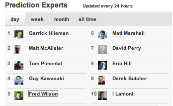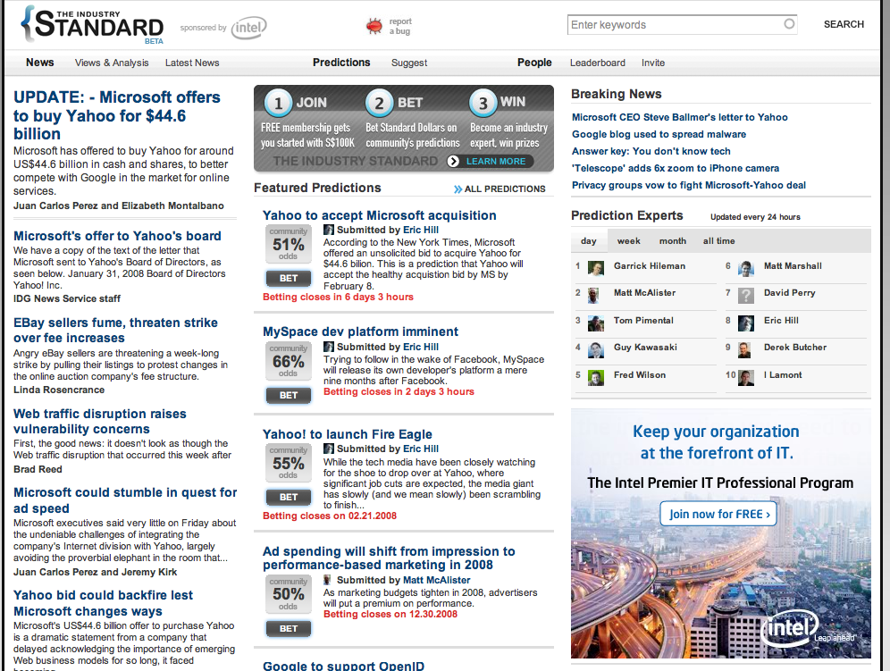 There are plenty of other sites that also try to generate collective wisdom using prediction markets, including HubDub, Trendio, and Yahoo’s Tech Buzz Game. The problem with most of them is getting enough smart people to participate on a regular basis. The new Industry Standard is trying to crack that nut by baking the predictive betting right into the core of the site. You read a story about Microsoft’s offer for Yahoo, and then you add your own two cents by predicting what will happen. Butcher plans to soon make it easy for people to grab any prediction as a widget and put it on their own blog or Facebook page as a syndication strategy.