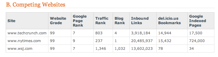 TechCrunch scored a 99 out of 100, but we do have some weak areas. Apparently, we use too many images and not enough metadata. Website Grader found 3,918,184 inbound links to TechCrunch, and 17,500 pages indexed on Google, where we have a PageRank of 7 (out of 10). Blogs by their very nature tend to do well on natural search results, because they are constantly updated and have a lot of links going in and out.