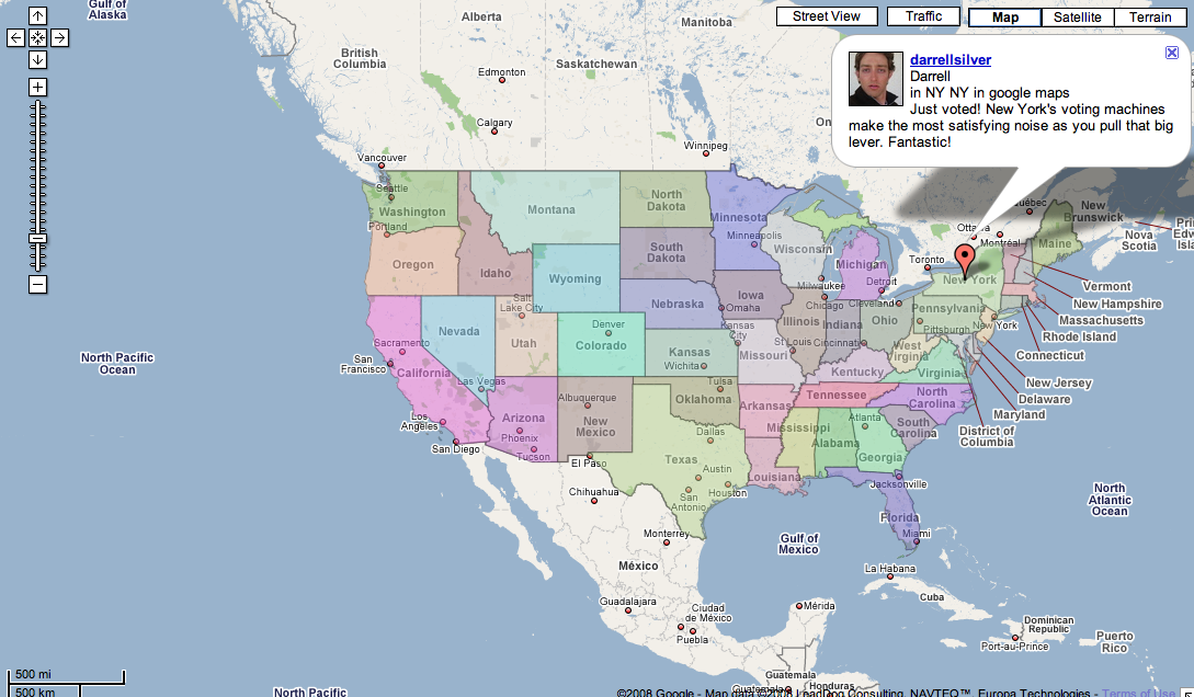 Tweets relating to Super Tuesday are overlaid on a Google Map, along with other data including YouChoose ’08 videos, Google News election headlines and primary state results. The site is live here. Google is also offering gadgets with the results as they come in.