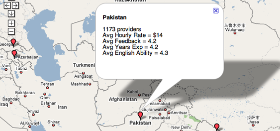 As you can see above, features include the ability to view average working rates, among other data about providers, from around the world on a Google map. You can also view an up-to-the-second metric of how much money has been spent on outsourced projects, as well as graphs of how rates and quality vary over time and providers.