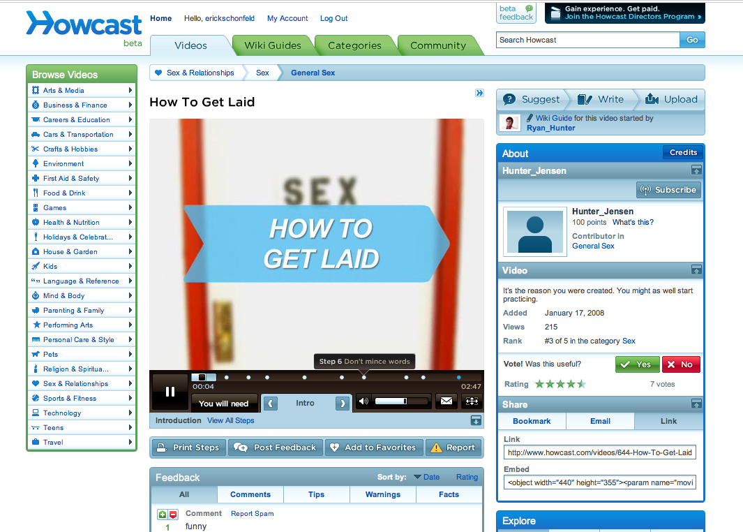 The site is launching with professionally-shot instructional videos on everything from “How to Paint a Wall” (see embed below) and “How to Groom Your Cat” to “How to Get Laid.” There is a familiar formula for each one: The Howcast graphic, an intro explaining what you’ll need for the task at a hand, and step-by-step instructions explained in a voiceover. The video player on the site lets you jump to different chapters or steps, lets you zoom in for a better look, and provides the transcript as well. Viewers can add comments in the form of tips, warnings, and facts to each video. And the Flash-based site lets you browse the video directory on the left hand side while you are watching a video without interrupting it or going to a different page.