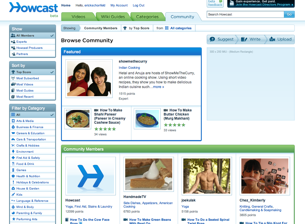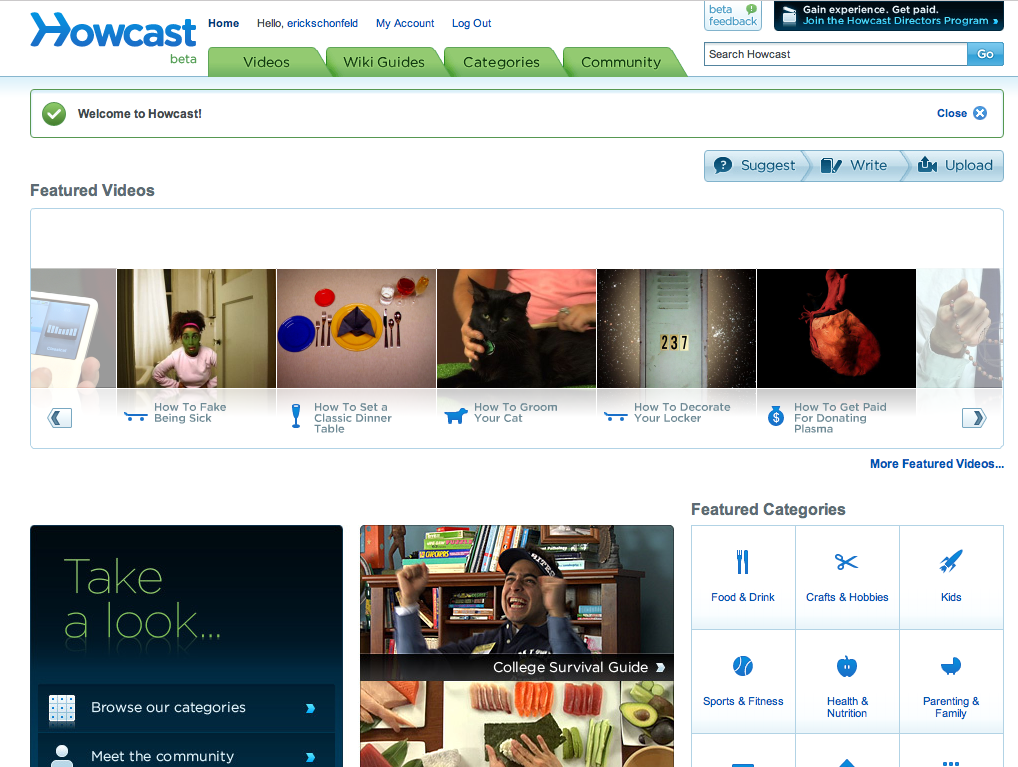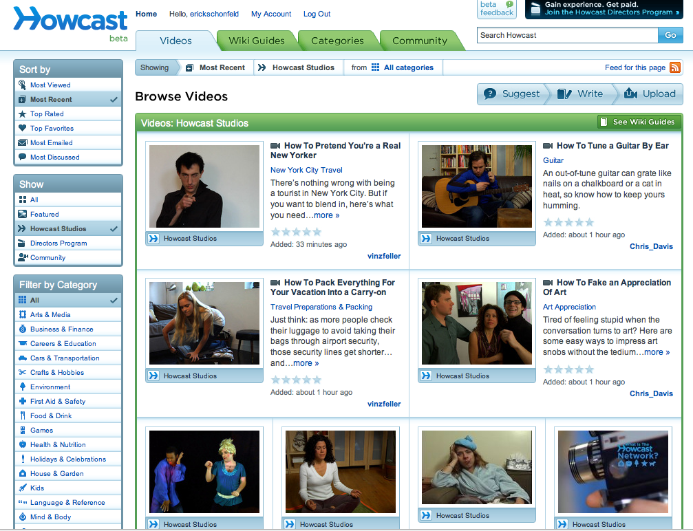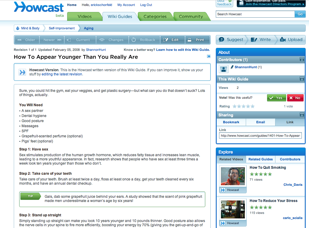 Audience members can also look at upcoming scripts and improve them or write their own in a guided wiki portion of the site that follows the Howcast script template (introduction, instructions, tips, end with a fact). The script is then approved by Howcast, a voiceover is recorded, and Howcast farms out the production to young film school students and graduates. They get $50 for each video plus a 50/50 rev-share from any advertising. Anyone can also upload their own instructional videos to the site without going through this process.