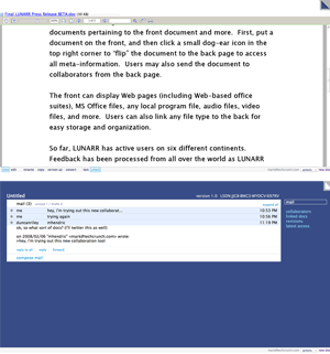 Lunarr is a service going into private beta that promises to put an end to the habit of emailing documents back and forth to collaborate. Its creators want to simplify collaboration by placing documents within the web browser and equipping users with wiki-like editing functionality and, more importantly, an email-like messaging system that associates messages with particular documents.