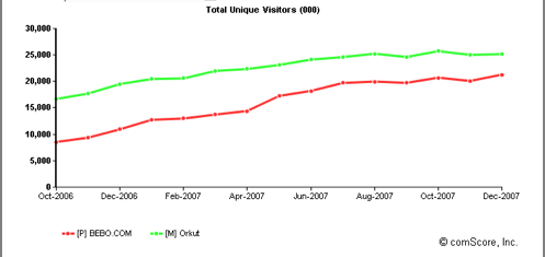 Google already owns Orkut, one of the biggest social networks globally, especially in Latin America. It just has not caught on in the U.S. Bebo is also a global play, but its strength is in English-speaking countries such as the UK, Ireland, Australia, and New Zealand. According to comScore, Bebo had 21 million unique visitors worldwide in December, 2007, with about 4 million in the U.S. Orkut had 25 million worldwide unique visitors. So Google would nearly double its social networking market share, as measured by active members. And it would have a strong English-speaking social network with which to begin to challenge Facebook here in the U.S.