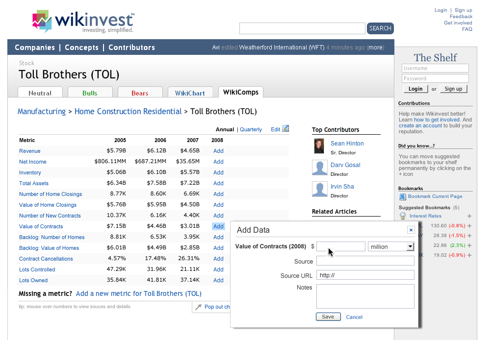 Financial and stock research sites like Yahoo Finance, Google Finance, Marketwatch, or CNNMoney have done a lot to democratize investment research by bringing reams of financial data for any publicly traded company to investors at the click of a button. But when it comes to financial metrics, much of the data they provide is the same for every company: revenues, earnings, PE ratios, market caps, assets, liabilities, analyst estimates, and so on. To really understand a company, this data is just a starting point. By the end of next week, Wikinvest is planning on introducing a new feature to help investors dig deeper. Says co-founder Michael Sha: