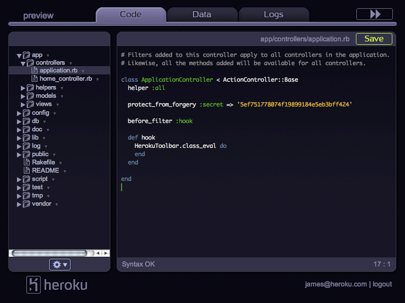 There are two sides to Heroku’s offering. The first is a completely in-browser development environment where RoR programmers can build their apps instead of doing so with software on their own computers. Relative to other programming languages, Ruby and the Rails framework can be particularly onerous just to install and configure. Heroku wants both amateur and advanced programmers to get coding right away by making RoR development possible with any browser-equipped computer.