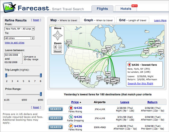 The new extended service still has limitations, for example a search for San Francisco International (SFO) to London Heathrow (LHR) offers airfares, but doesn’t provide a prediction service despite LHR being a major gateway into Europe, where as SFO to Mexico City now does. Farecast can be used in a similar fashion to general travel sites such as Expedia as a general airfare and booking service; a search for Melbourne (MLB) to SFO gave similar results to the SFO-LHW search, although despite Farecast providing price comparison links to sites including Expedia, there was no price advantage at all over the other sites.