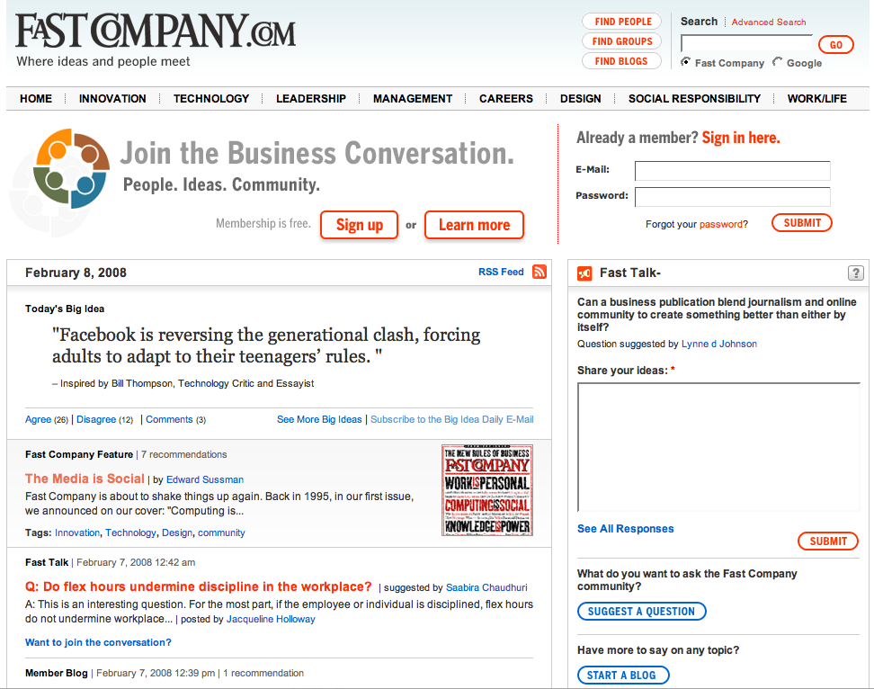 On FastCompany.com, you can now start your own blog, join a group, post a video, comment on articles, or suggest a “Fast Talk” question to start a debate. Articles from the print publication are interspersed with blog posts from readers, experts, and staffers, and are arranged in a blog-like chronology on the front page.