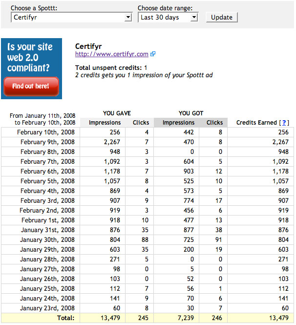 Spottt is also providing real time statistics for users, including the number of ads you’ve shown, the number you’ve received (half of that) and the number of clicks on both ads you are showing and those you are receiving. Click on the image for a larger view of sample stats.