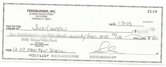 It’s always fun to get the monthly Feedburner check for advertising they insert into the RSS feed. The actual dollar amount is still next to nothing, but I love the fact that, even with nearly 800,000 publishers, 1.4 million managed feeds, and a $100 million payday from Google, they still haven’t automated the check writing process. Someone hand writes all of these checks every month.