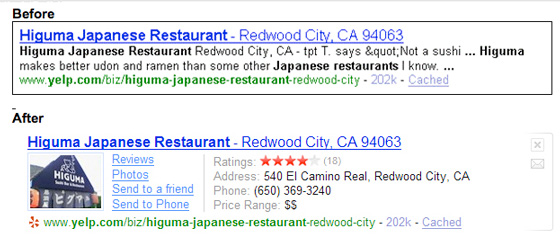 The altered results can contain far more information than the current link and a bit of text from the website. For example, Yelp (a user generated local business review site), one of the launch partners, will include a photo, review information and the address and phone number of the business.