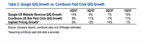 A more likely explanation is that Google is tightening the reins on clicks to combat click fraud and generate better clicks in general. Also the correlation between comScore’s click-through estimates and Google’s revenues has been highly inconsistent in the past. It definitely isn’t a one-to-one correlation. For instance, in the fourth quarter of 2007, comScore showed a 25 percent year-over-year paid click-through growth rate, yet Google’s actual U.S. revenues grew 46 percent. In the third quarter of last year, comScore showed a 48 percent growth rate for paid clicks, compared to an actual 58 percent growth in revenues. Sequential quarter-over-quarter comparisons are even more all over the map, according to calculations by JPMorgan.